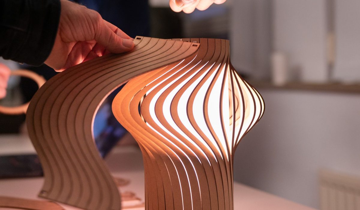 Die Lamellen der Lampe können aus verschiedenen Materialien wie recyceltem Kunststoff, Sperrholz, Acrylglas oder Karton gefertigt werden. Die Parametrik des Designs ermöglicht es, Materialstärken und -arten einfach anzupassen.